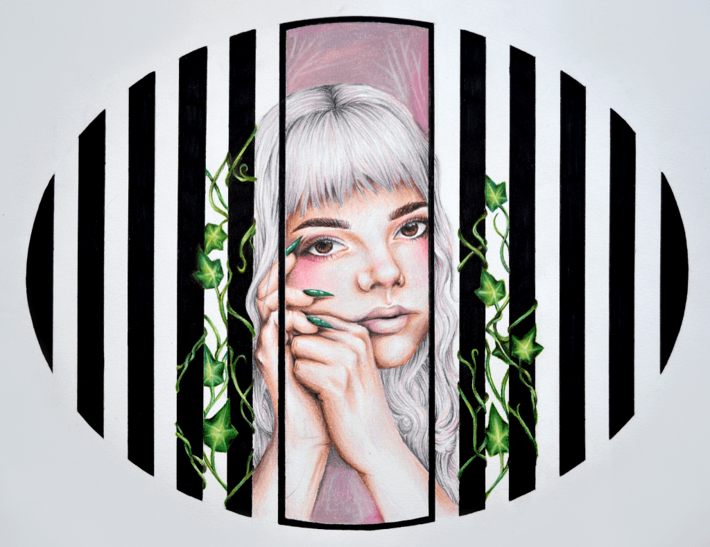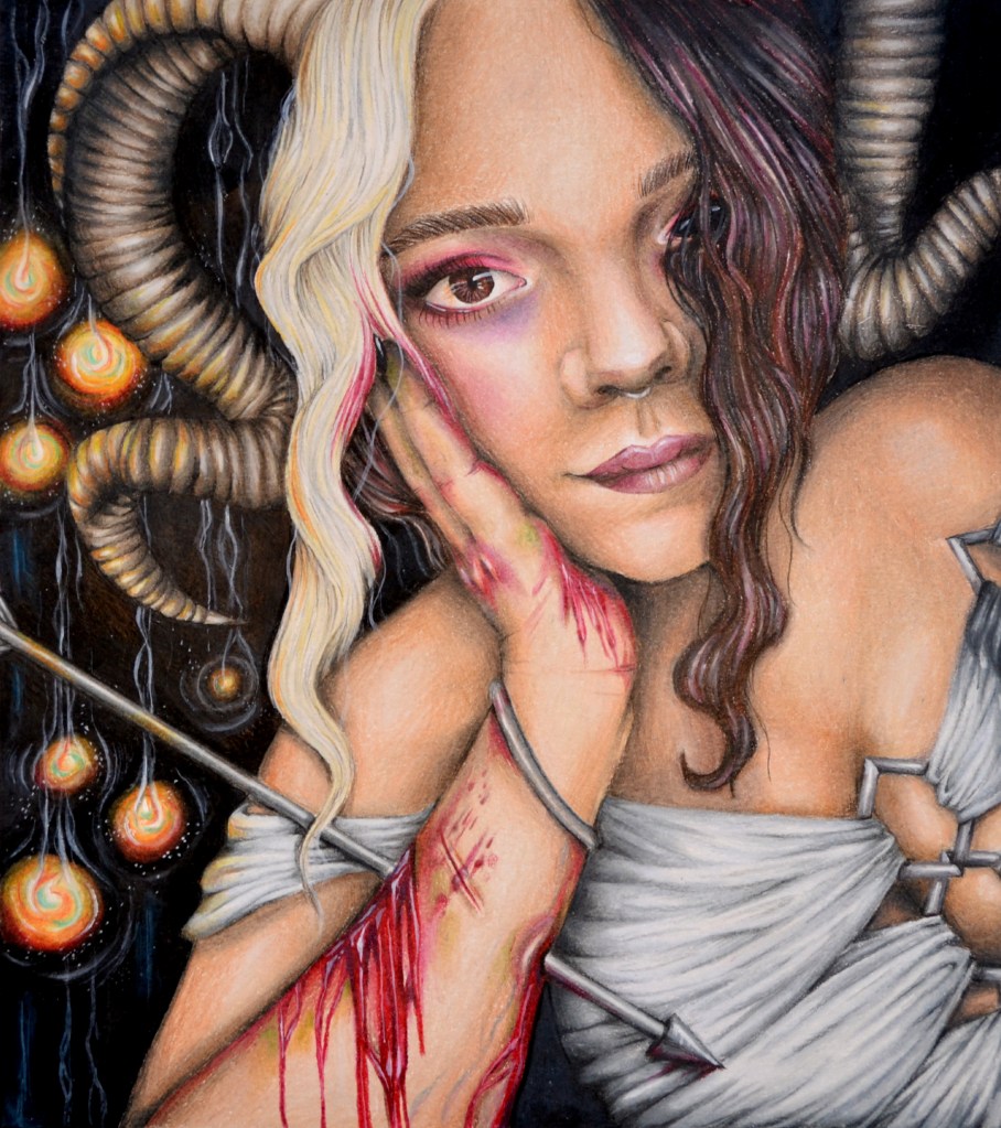 “Psychoactive” color pencil on bristol paper, 2024.“The Malformation” color pencil on bristol paper, 2022-2024“Capricorn. Aries. Sagittarius.” color pencil, acrylic paint on bristol paper, 2022.“Self Portrait” color pencil & ink on britsol paper, 2020.